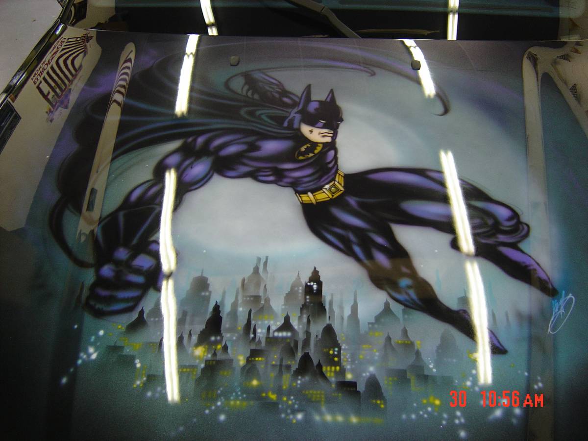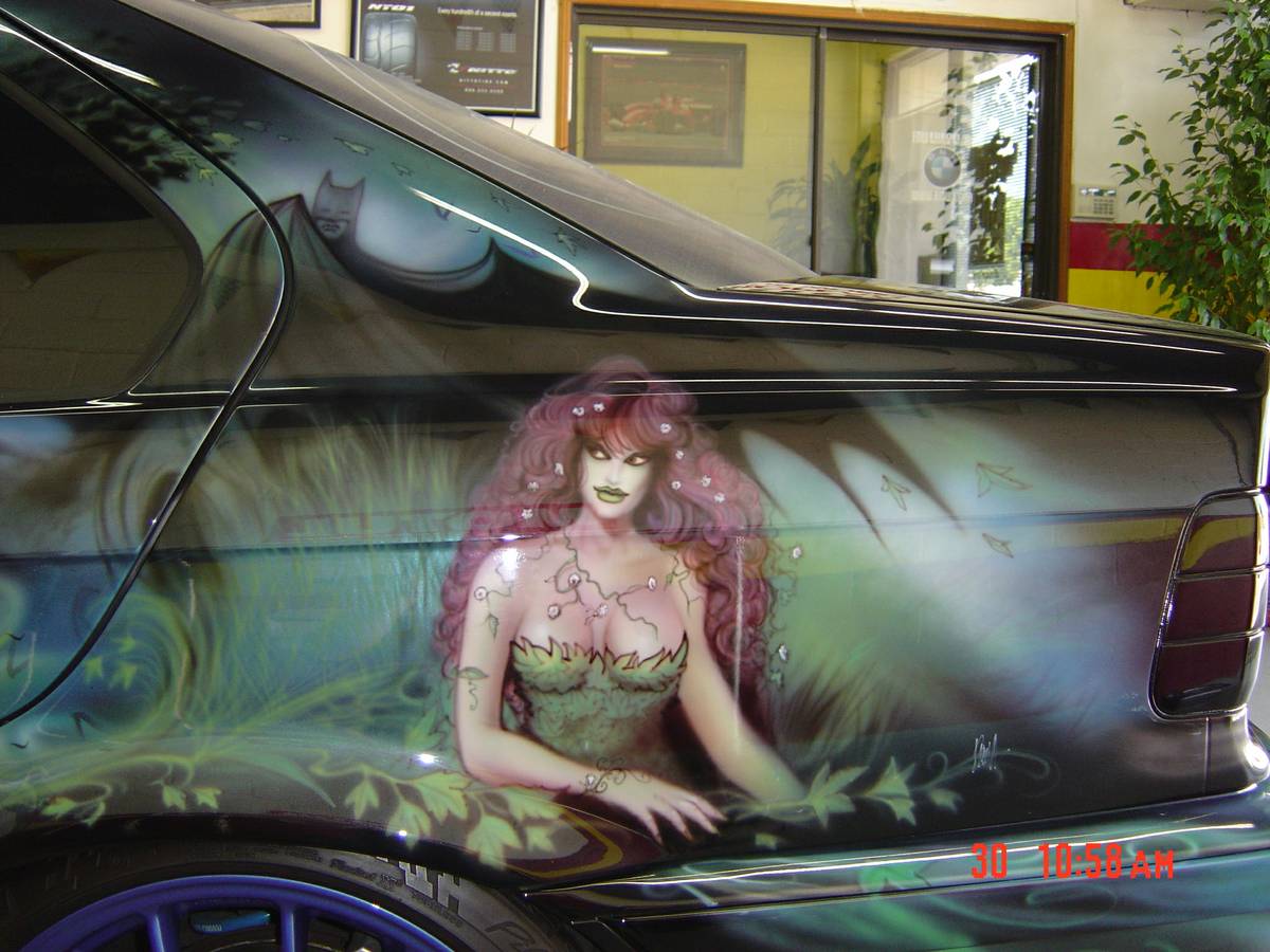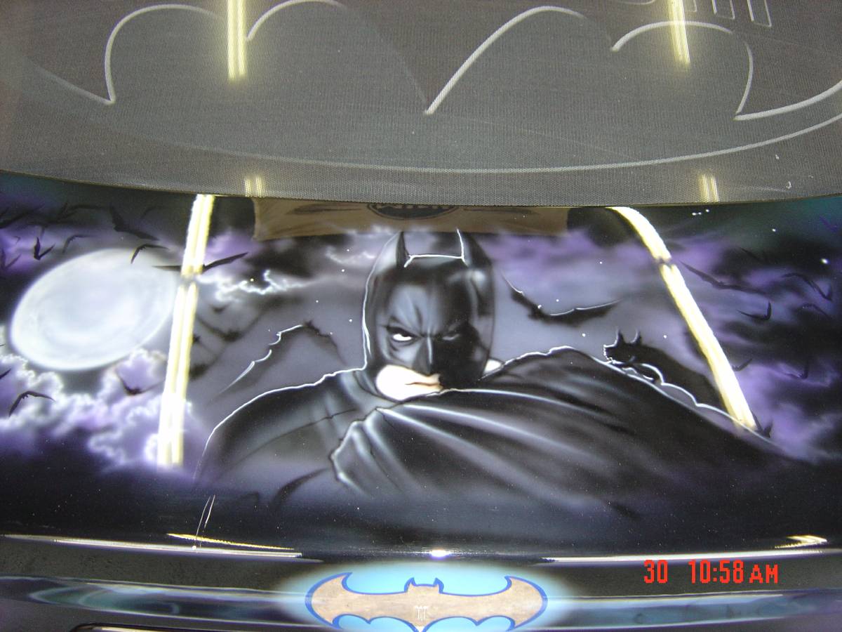 Honestly, the mural is quite well done on this car, for the most part, though Poison Ivy looks a bit odd on the rear quarter panel. The more we look at the car, the less we find it objectionable. And the more we decide we’d probably drive this bat mobile regularly if it were in our garage. One caveat to that, however; Batman should never, EVER be depicted riding on a giant bat.