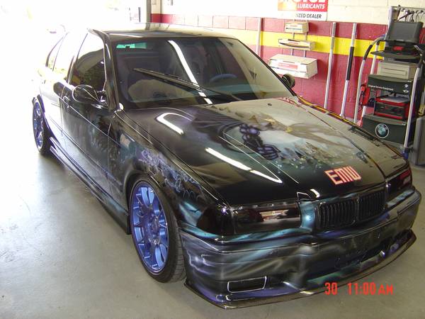 First, the car was fitted with everything that makes an M3 an M3, including a euro-spec S50 engine and 5-speed manual gearbox, plus all of the M3 bumpers and side skirts. The ever-elusive M3/4-door/5-speed is in high demand, so making your own from a 325i makes a lot of sense. After all of that work was completed, a “Hollywood” artist performed a complete airbrush custom paint job.
