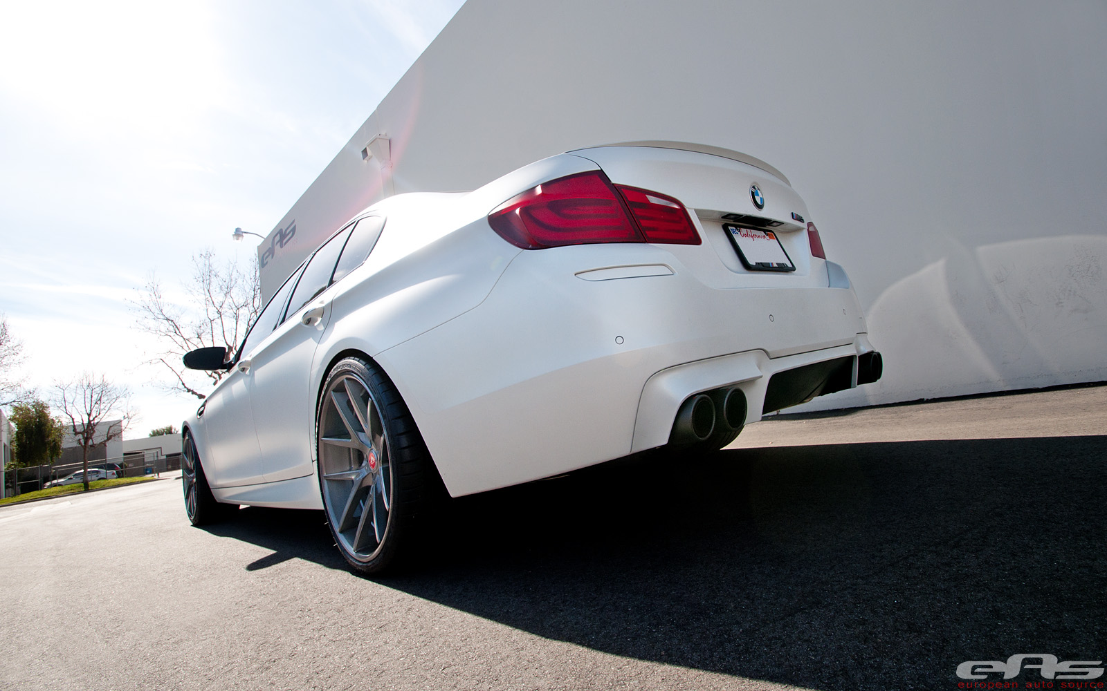 In this case, the work has been done by the European Auto Source for a customer. The paint is done in the M branch’s exclusive frozen white. You can’t really tell in the photos, but the car has something like a satin finish instead of the typical gloss. In person, it looks great, but it’s difficult to see in pictures. More obvious changes include the wheels the stance. EAS has swapped out the stockers for 21″ Vorsteiner VS-310 three piece forged wheels. The drop comes courtesy of H&R lowering springs.