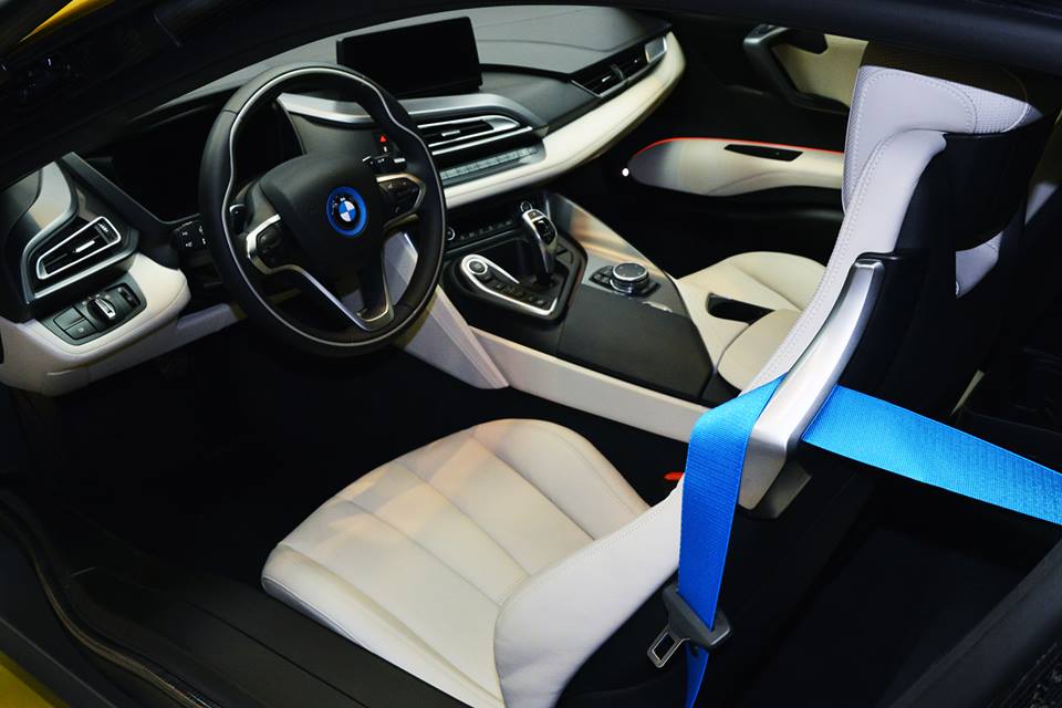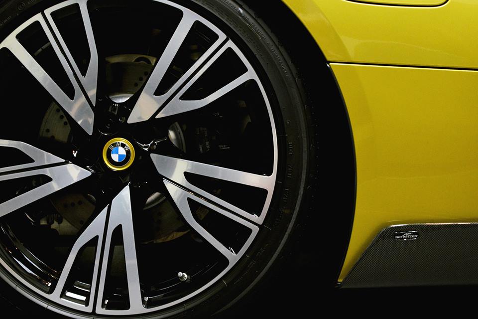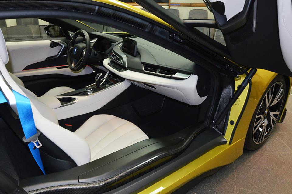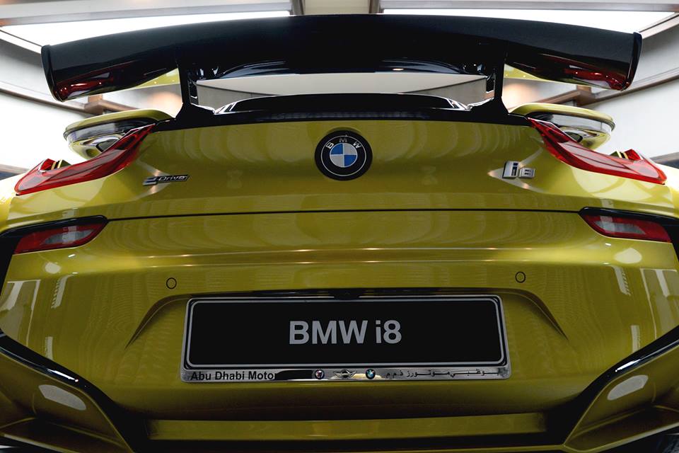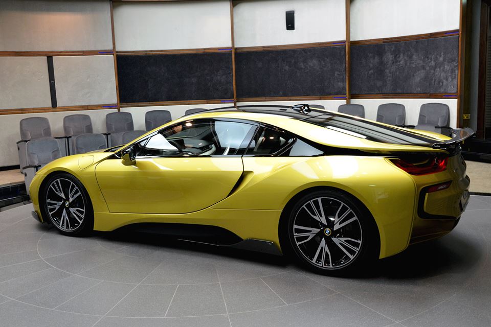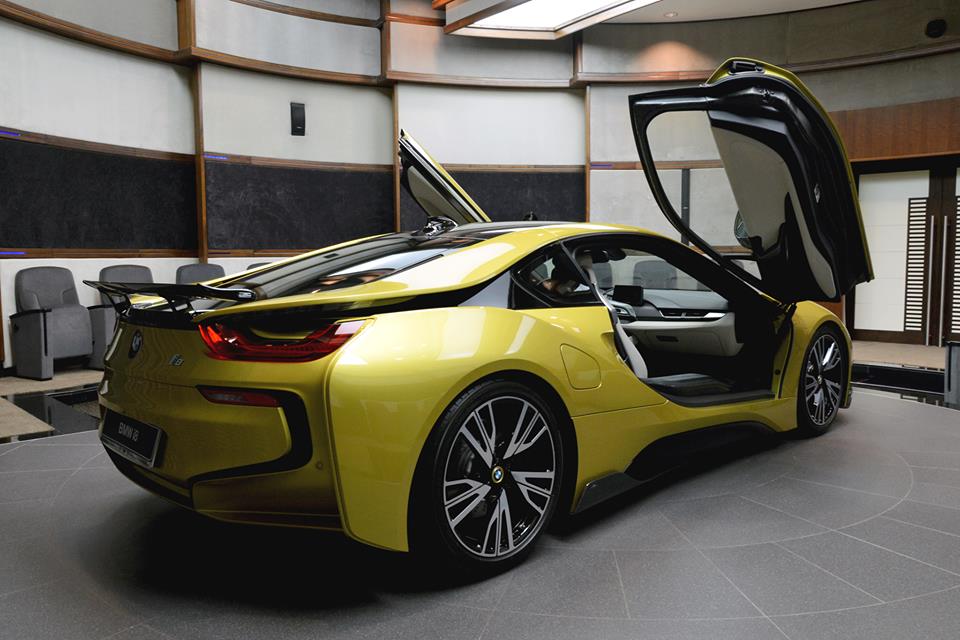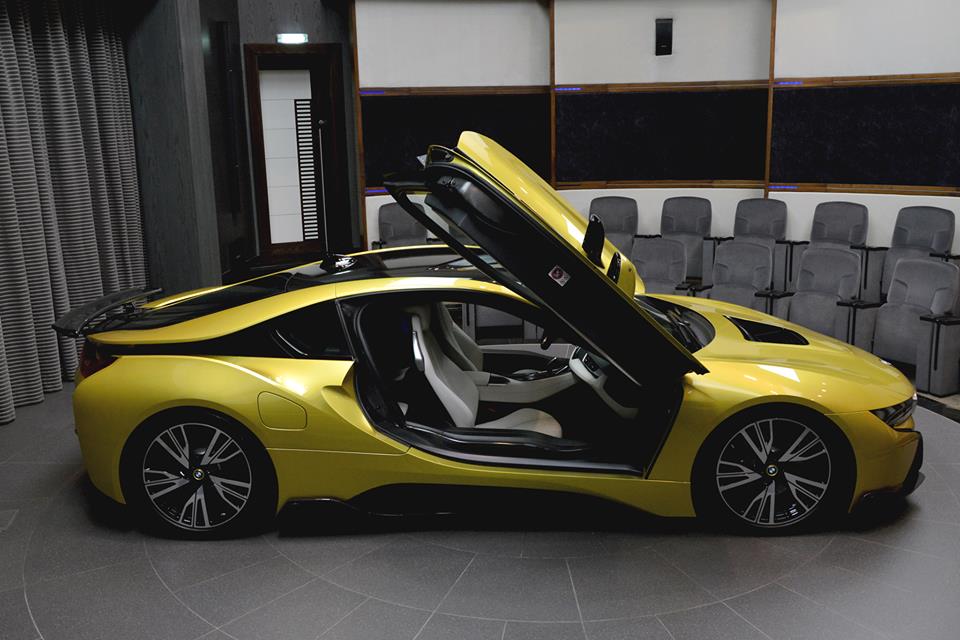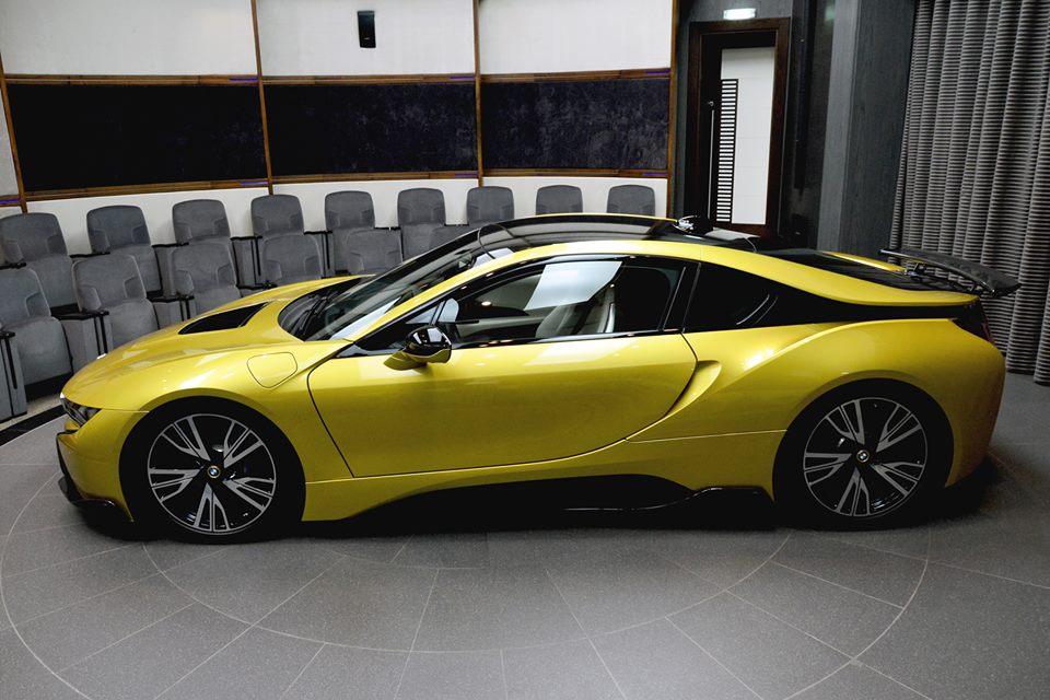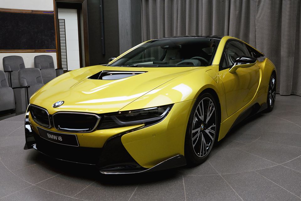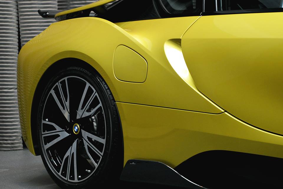 See the resemblance? Okay, maybe the car is a little less spiky. Either way, they both look pretty fierce. This custom i8 is currently housed at BMW Abu Dhabi. It has a partial aftermarket aero kit from AC Schnitzer and has an exterior called Austin Yellow, an M4 color option. It has a front spoiler, side skirts, a rear diffuser, and a fixed rear wing.