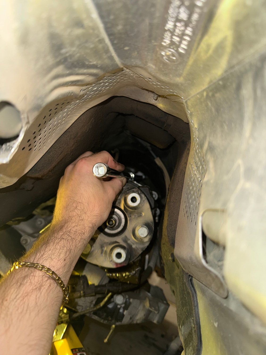 After that you’ll remove the under body plastic trim panels. On the back left side of the car there’s a metal support bar that needs to be removed. Following with the exhaust system, heat shields, then the rear drive shaft and front drive shaft. Use a flat head object or flat chisel works good to separate the drive shaft from the rear differential.